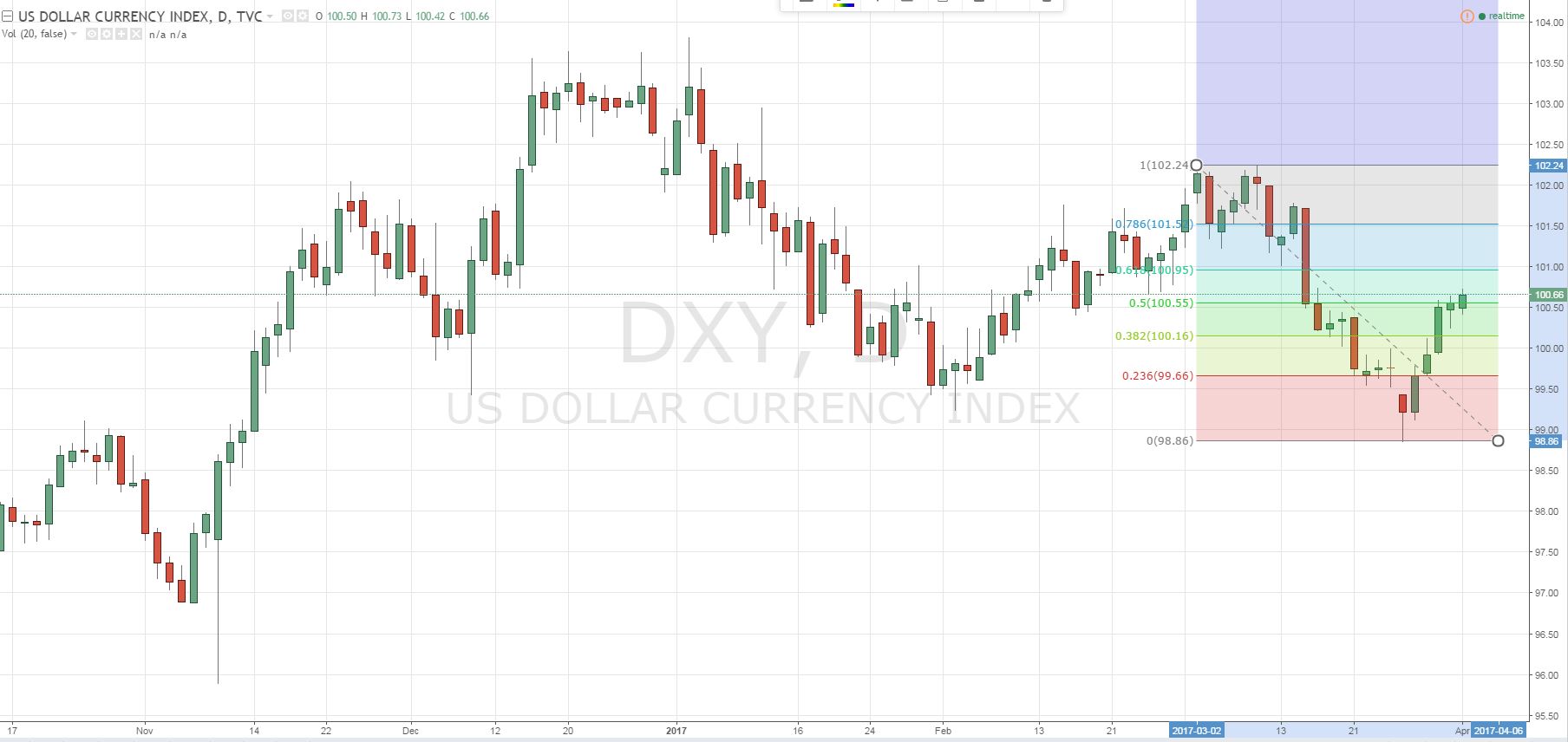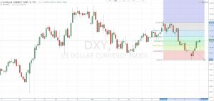 From a technical analysis point of view, the US Dollar index is now trading within a selling zone according to Fibonacci retracement.