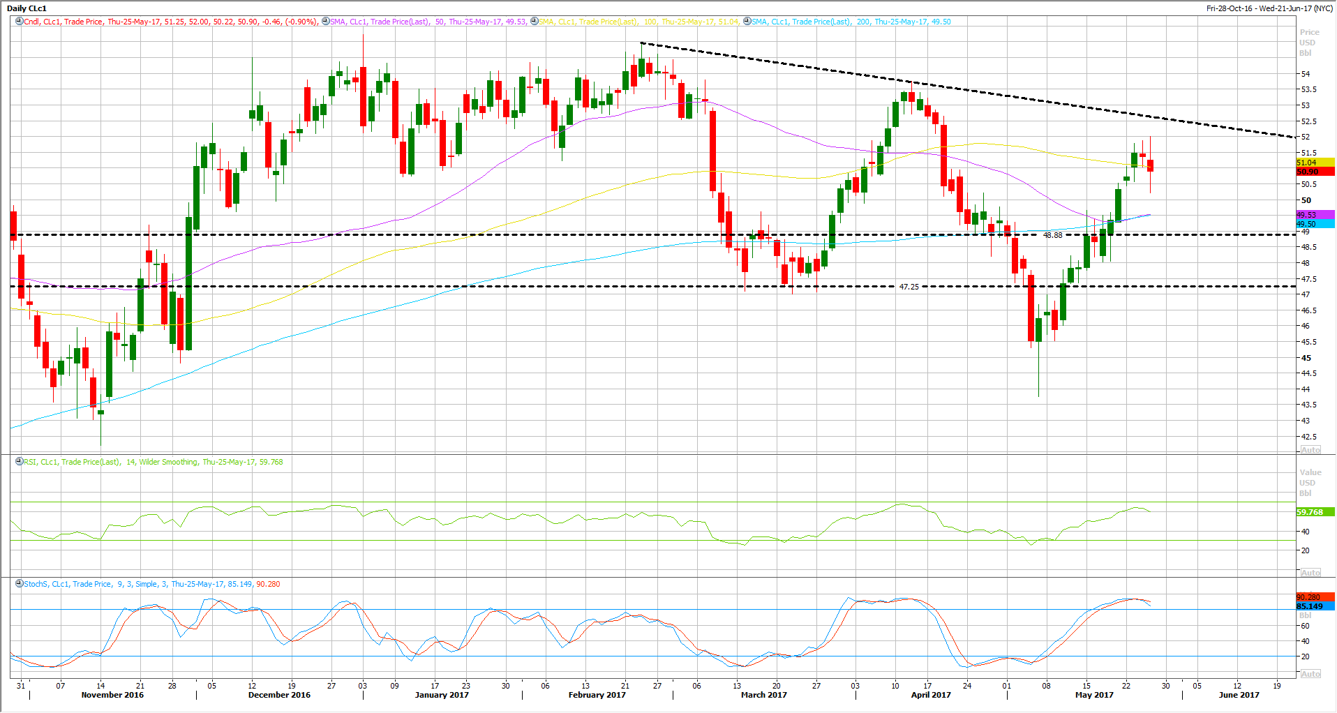Brent declined all the way back from its intraday high at 54.60 to as low as 53.30, while WTI Crude fell off a cliff from 51.97 session high to 50.30 session low.