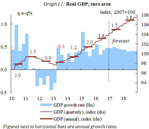 The spring forecasts released last week on 11 May showed that the European Commission expects the growth of the gross domestic product (GDP) in the 19-nation Eurozone to rise 1.7% this year and 1.8% in 2018. The growth forecasts were slightly higher from 1.6% and 1.8% from the Winter forecasts.