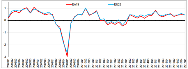 Preliminary data from Eurostat released earlier this week showed that the pace of economic output expanded 0.5% on a quarterly basis in the three months ending March 2017, beating estimates of 0.4%.