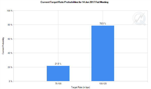 The CME Group’s Fed funds futures probability stands above 75% s of last Friday, May 19, 2017. The markets will still have to wait for the May jobs report while the overall expectations for two more rate hikes this year remains.
