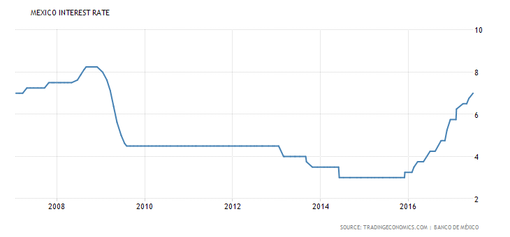 Yesterday’s rate hike marks a seventh consecutive rate hike from the Mexican central bank. Interest rates in Mexico stand at the highest levels since early 2009.