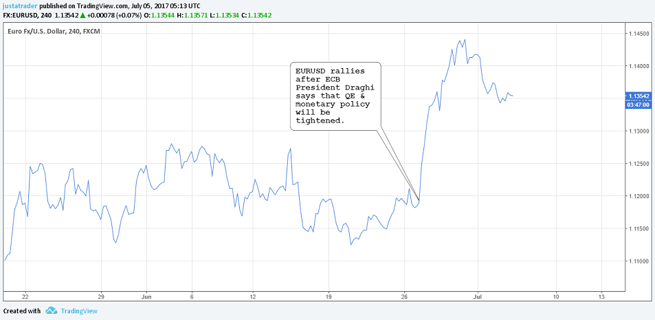In the above example, you can see the strong rally in EURUSD following the hawkish comments from the ECB president Mario Draghi that monetary policy could be tightened.
