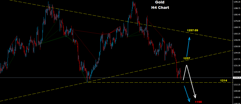 Gold managed to hold downtrend pressure where market trying to test 1214-15 support zone