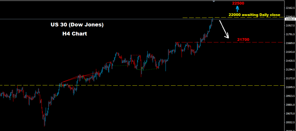 Dow managed to sustain advance toward target 21980 as we advised yesterday , while market managed to hit 22000 zone where the daily close may give more signals over market intention