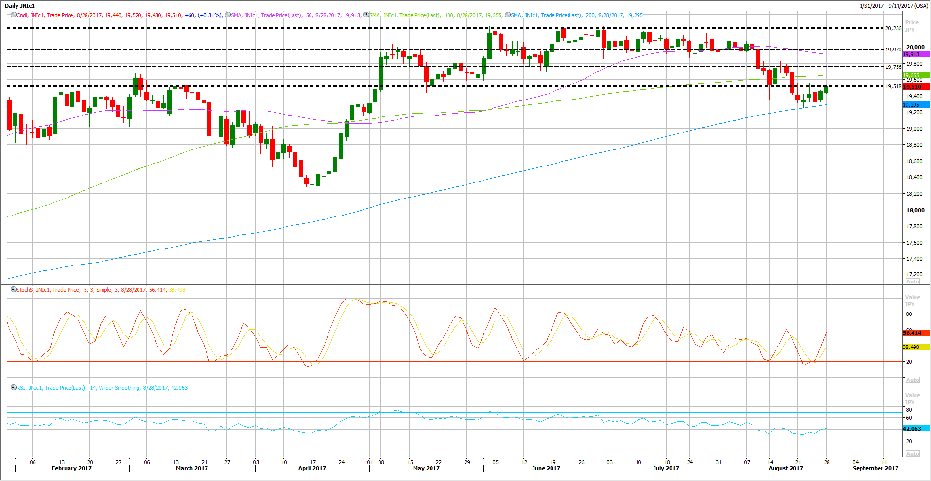 The Nikkei 225 declined earlier this month from its highest level in almost two years around 20,300 all the way back to 19,250 after breaking through its 50 and 100 DAY MA on the daily chart.