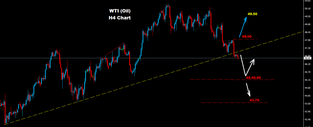 Crude Oil managed to fell below 46.80 which may add more drop pressure for farther drop