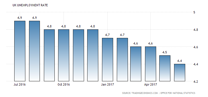 Data from the UK’s Office for National Statistics showed yesterday that the ILO unemployment rate fell to 4.4% in the second quarter ending June. Compared to a year ago, this was lower than 4.9%. Economists were expecting to see the UK’s unemployment rate remain unchanged at 4.5%. The unemployment rate was the lowest since 1975, according to the ONS.