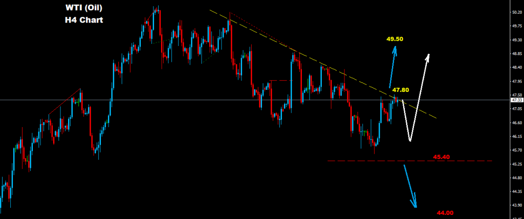 Crude Oil managed to advance above 47.20 while market facing downtrend resistance line at 47.80
