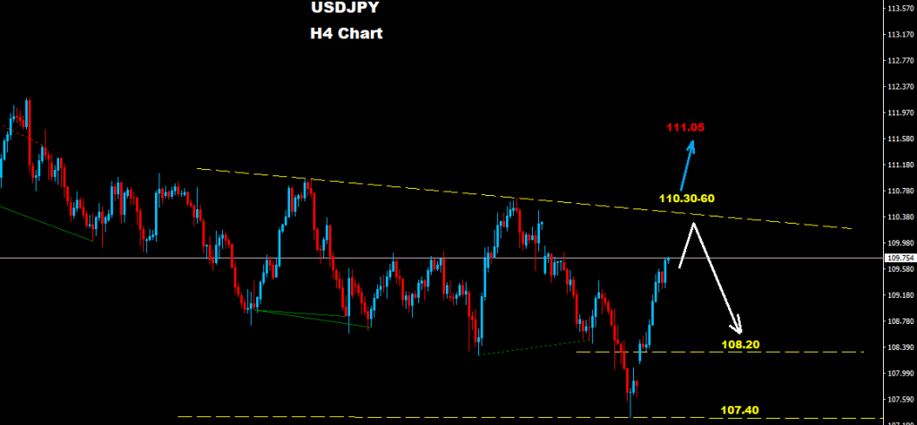 USDJPY managed to jump above 108.60 which activated more advance wave which may target 110.30-60 zone as we advised before