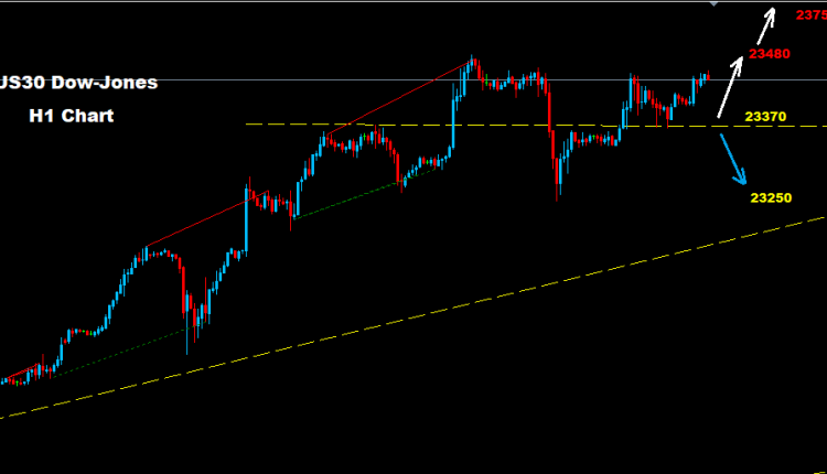 Dow managed to jump again above 23370 which may hold strength toward re-test 23480 zone