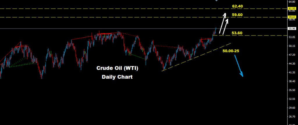 As we see over the chart, Oil facing support at 55.00 and 53.60 where as long as market holding above one of those supports more advance toward 59.60 zone is expected