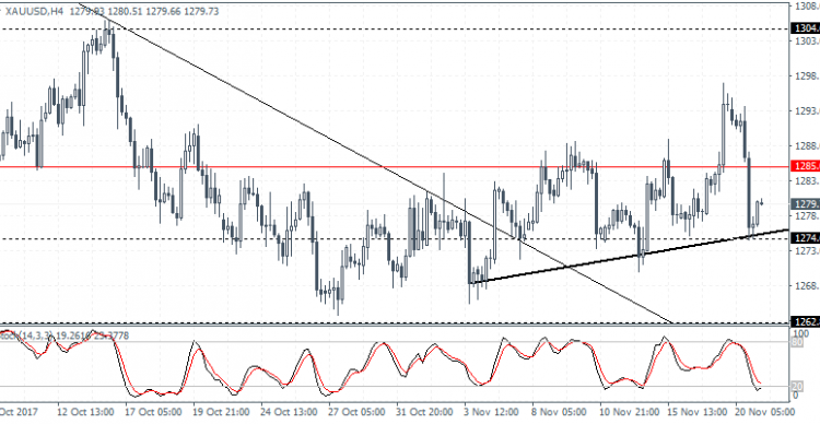 XAUUSD (1279.73): Gold prices gave up the gains following the fake break out above 1285 level. Price action failed to hold on the gains as the resistance level of 1285 failed as support. The decline to 1274.70 region puts gold prices back into a sideways range. Support at 1274.70 came due to the confluence between the rising trend line and the horizontal support. Further declines can be seen on a break down below this level of support. This could put gold prices at risk of a decline towards the 1262.00 level of support.