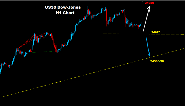 Dow managed to hold trades above second support 24670 where as long as market holding above another advance wave toward 24980 target is expected