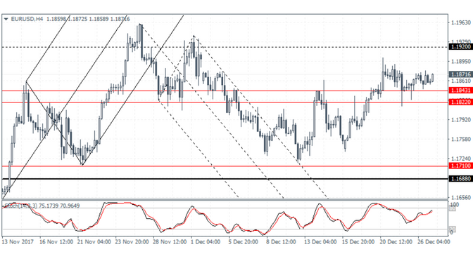EURUSD (1.1871): The EURUSD closed with a doji candlestick pattern on the daily session yesterday. Price action was seen consolidating above the 1.1843 – 1.1822 level of support which indicates further upside in price. On the 4-hour chart, the EURUSD is likely to break the consolidation to the upside with the potential bull flag pattern. Immediate resistance at 1.1920 is likely to be the near term upside target in price. Alternately, in the event that EURUSD fails to break higher, we could expect price action to continue trading flat above the support level.