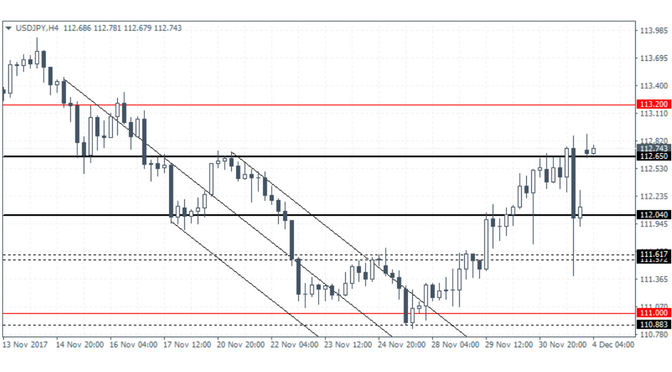 USDJPY (112.74): The USDJPY formed an outside bar on Friday and closed bearish. The intraday rally towards 112.65 was met with strong resistance as the U.S. dollar pared gains. Price action closed on Friday right near the lower support level at 112.04. We expect to see the broader range within 112.65 and 111.61 being maintained in the short. The currency pair also fell to this support level briefly before pulling back higher to settle at the next support level. There is also a possibility that USDJPY will be forming an inverse head and shoulders pattern with the neckline resistance seen at 112.65. Therefore, watch for potential reversals within 112.04 and 111.61 which could signal a move back to the neckline resistance.