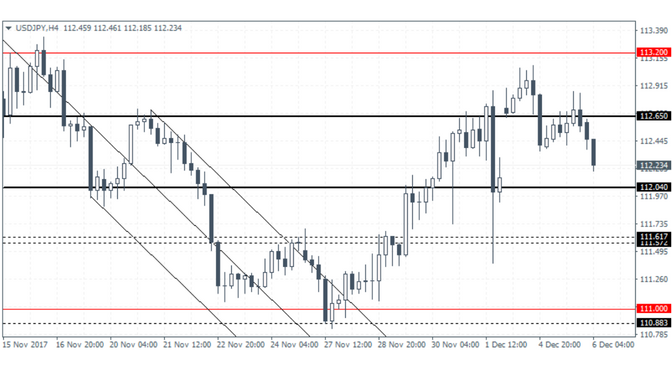 USDJPY (112.23): The USDJPY attempted to push higher but price action closed with an inside bar on the daily session. The current downside breakout could signal a near term decline if the U.S. dollar manages to close bearish. In the short term, the currency pair could be seen falling back to 112.04 level of support. This marks a retest of the support level while also filling the gap from Monday’s open. The overall bias remains flat as we expect USDJPY to remain supported near 112.04. A breakout from the 112.65 and 112.04 region will potentially pave way for further gains or declines.