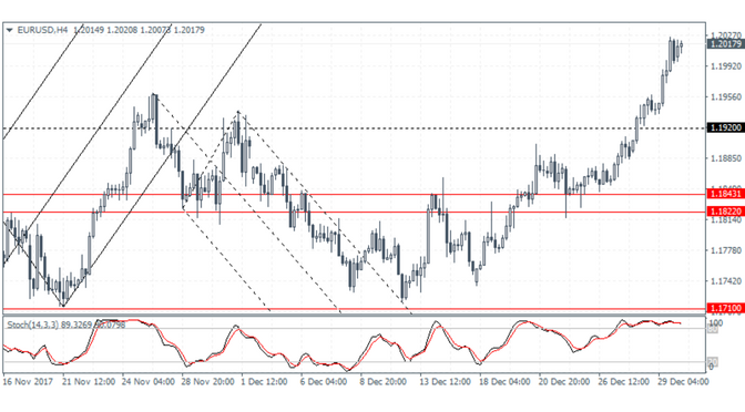 EURUSD (1.2017): The EURUSD rallied to a 3-monh high on an intraday basis on Friday closing in at 1.1997. The common currency maintained the gains as it opened on Tuesday near the same levels. In the short term, we expect that the EURUSD is likely to maintain the upside momentum. However, consolidation is expected as price action approaches the 1.2000 – 1.2050 handle. At the time of writing, EURUSD is seen trading near the highs. We expect to see short term correction in prices taking place. Support at 1.1920 remains the initial support to the downside, followed by a steeper test of support at 1.1843 – 1.1822.