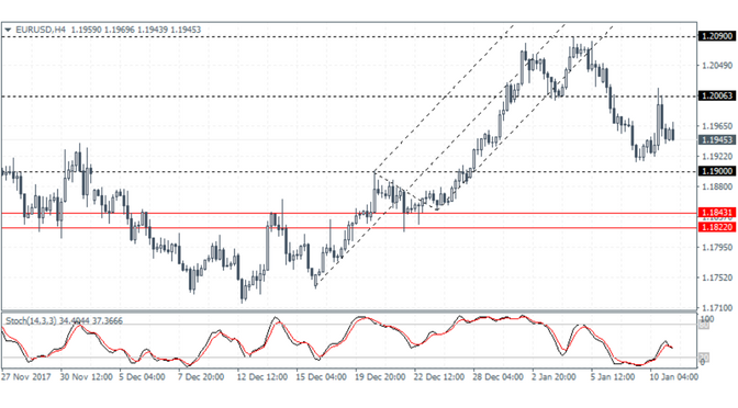 EURUSD (1.1945): The euro managed to post gains on the day as the yen’s strength was seen weakening the U.S. dollar. EURUSD rose to a high of 1.2017 before the common currency gave up those gains to settle the day at 1.1947. The rebound in prices saw EURUSD briefly testing the support level at 1.2006 as mentioned in yesterday’s note. The declines could likely resume in the near term as the technical support level at 1.1900 remains yet to be tested. Further gains could be seen coming only on a bullish close above 1.2006 level.