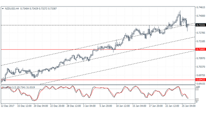 NZDUSD (0.7338): The NZDUSD posted a second day of declines on Thursday as the rebound in the U.S. dollar pushed the currency pair lower. Price fell below the 0.7333 level earlier today but quickly managed to rise back. In the short term, NZDUSD could be seen consolidating at these levels but the momentum could be weakening as the support at 0.7160 remains in focus to the downside. For the kiwi dollar to post further gains, price action is expected to rise above the previous highs near 0.7400 in order to continue the rally.