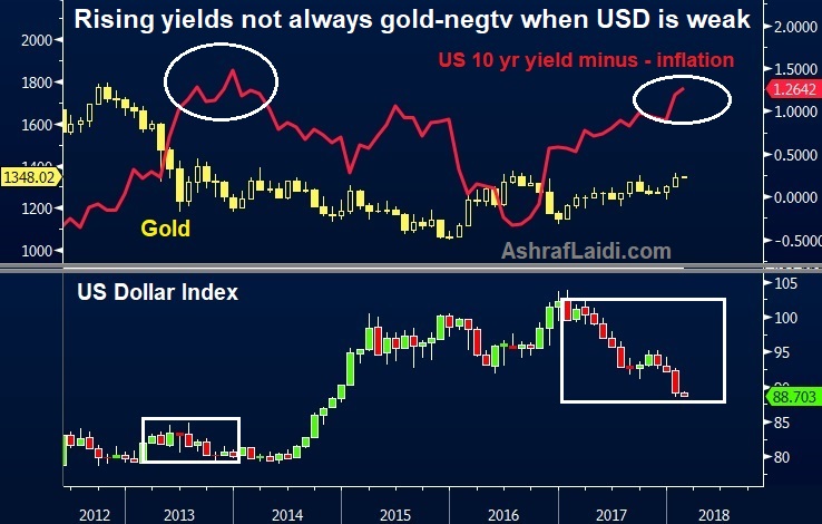 As bond prices fall and their yields surge to the highest in over four years, there may be a risk that the advance in yields could begin eroding the returns from gold. After all, gold pays no interest or coupon. I mentioned four months ago that “we must look at the ‘real’ level of interest rate, or interest rate minus inflation. It does not matter how high interest rates and bond yields are if their level is not high enough to make up for the level of inflation”.