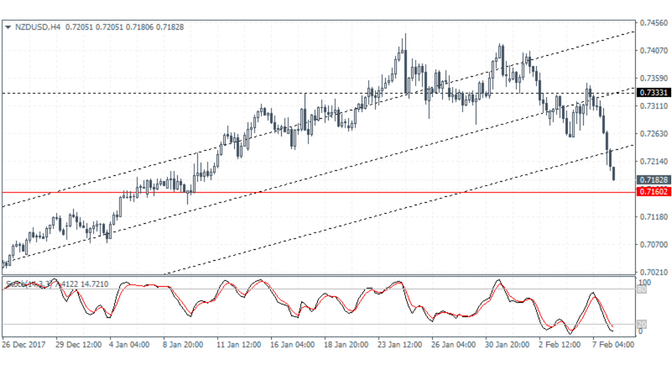 NZDUSD (0.7182): The New Zealand dollar was seen weakening since the RBNZ’s decision. Price action briefly tested the breached support level at 0.7333 where resistance has been established. The reversal off this level has seen price declining with the first support level at 0.7160 within reach. Expect to see NZDUSD potentially rebounding at this level but the gains could be limited within the resistance level of 0.7333 and the current support. We expect the longer term trend to point to the downside with NZDUSD likely to see further declines that could test the lower support at 0.6950.