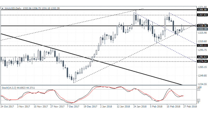 XAUUSD (1332.39): Gold prices rallied briefly towards 1338 level but failed to close higher on the day. As price retreated, the consolidation over the past few days could trigger a downside breakout as long as the established resistance at 1338 is not breached. The initial target to the downside remains at 1303 level. Further declines could be expected as gold prices could likely touchdown to the 1282 – 1274 region of main support that is yet to be tested. In the event that gold prices manage to close above 1338, then the bias shifts to the upside with the next upside target seen at 1357.