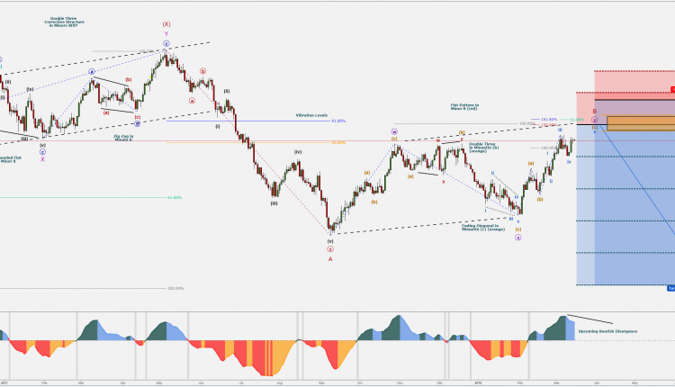 - Flat Pattern is pointing towards the 61.8 Fibonacci Retracement of Minor A (red), which also coincides with the 100% Fibonacci Extensions of Minutes w & x (purple), but also with the 150-161.8% Fibonacci Extensions of Minuettes (a)&(b) (orange), projected levels of Minuette (c) (orange).