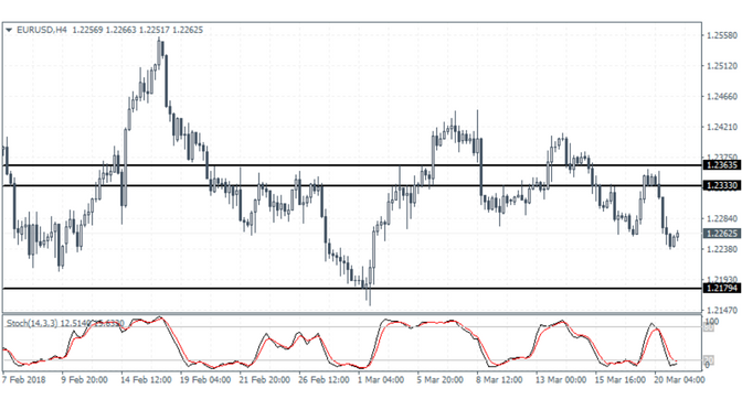 EURUSD (1.2262): The euro currency gave up the gains from Tuesday. A modestly stronger U.S. dollar and some weak data from the Eurozone added to the declines. The German ZEW economic sentiment fell to an 18-month low for March. However, current conditions index was seen to have remained broadly stable. From a technical perspective, expect to see some volatility in the EURUSD today heading to the Fed meeting. Following the reversal near the resistance zone of 1.2363 – 1.2333 level, we expect the common currency to maintain the range, touching down to the lower support at 1.2179. A close below 1.2179 will expose the euro toward the next lower support at 1.2090 – 1.2070 level.