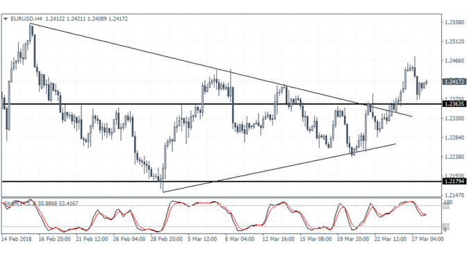 EURUSD (1.2417): The euro currency was seen briefly posting a fresh monthly high at 1.2476 on the day before giving up most of the gains. Price action was bearish following the strong gains from Monday. On the 4-hour chart, price action was seen drifting back to the breached resistance level at 1.2363. A retest of this level could confirm the support that could keep the EURUSD biased to the upside. However, with momentum easing, there is scope for the EURUSD to slip back below this level in the medium term and could enter back into the range that it maintained.