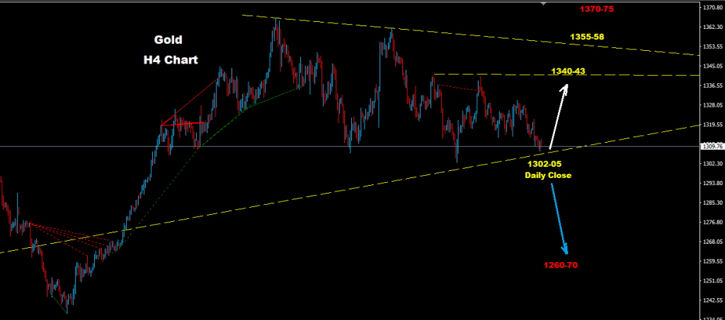 Gold managed to sustain drop pressure where market closing again from support line 1302-05
