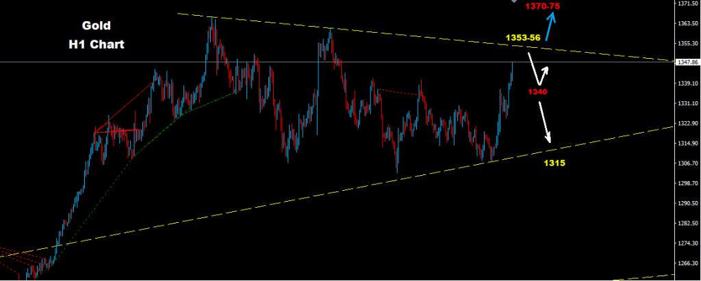 Gold Still trying to sustain his last advance to test resistance downtrend line around 1353-56