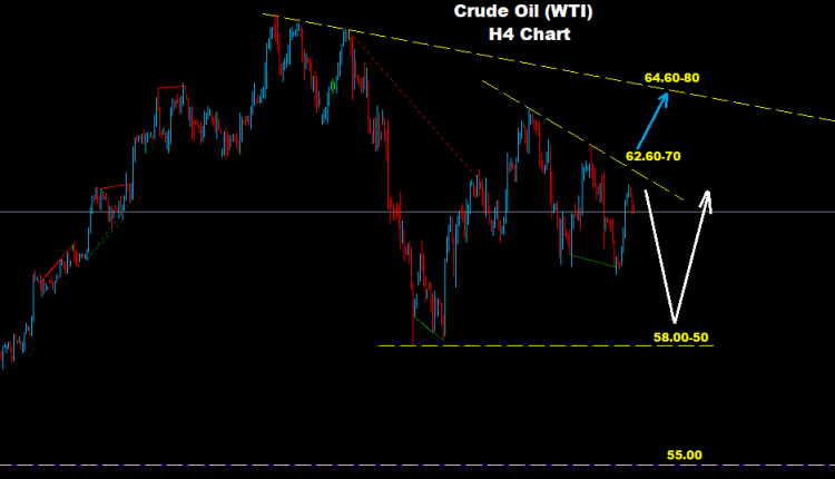 Crude Oil seems still holding trades below downtrend line as we see over the chart where resistance laying at 62.60-70 zone