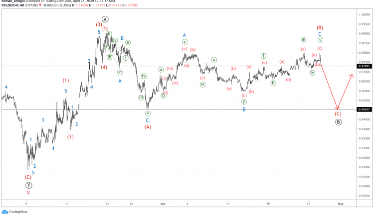Wave (A) is a simple zigzag, however, wave (B) resembles a flat too. Now completed at the minor wave A’s top, we can expect the market to decline in the impulse wave (C) near wave (A)’s low at 0.9501.