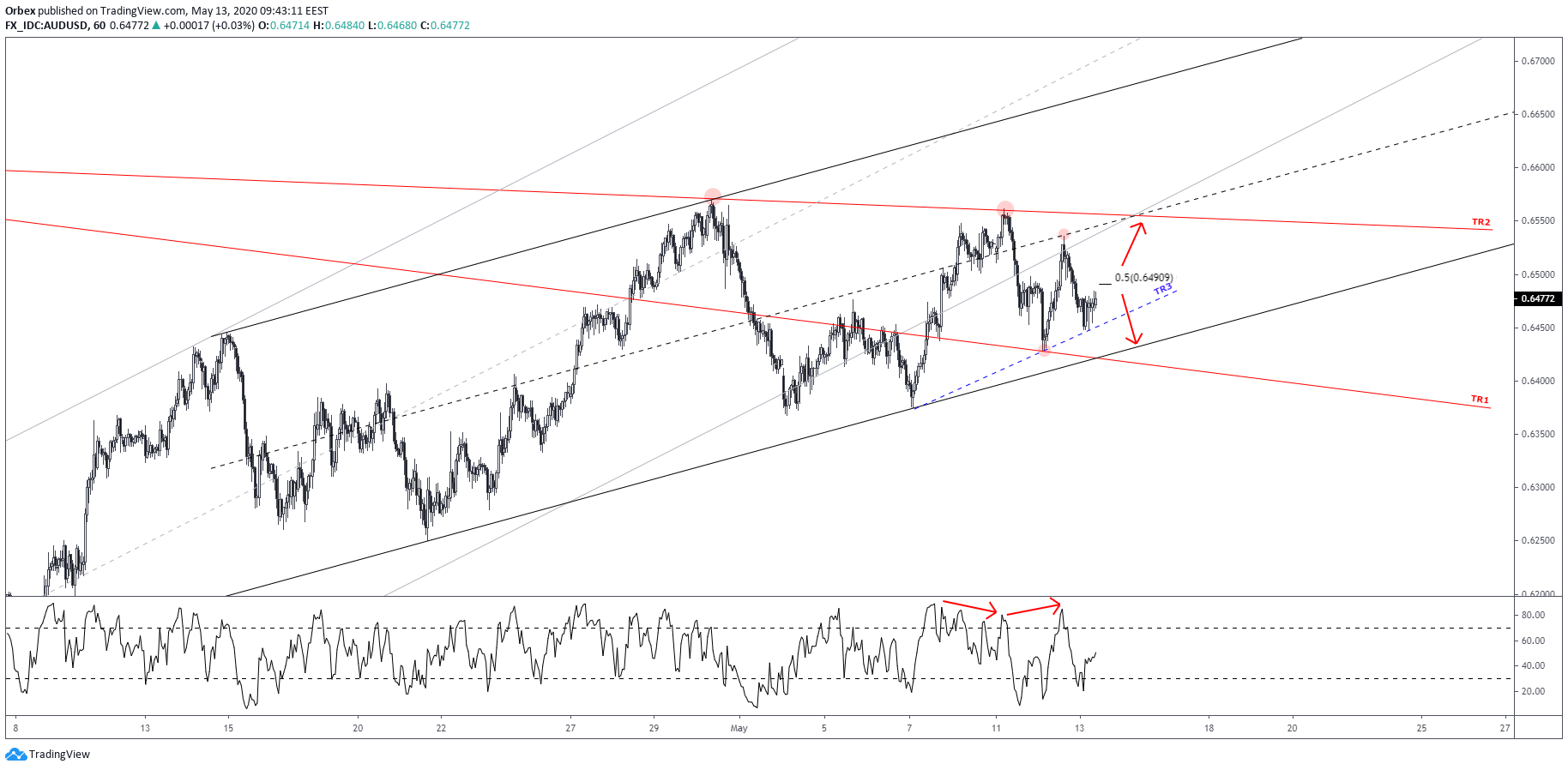 On the 1-hour AUDUSD chart below, we draw a shorter-term ascending channel for additional guidance.
