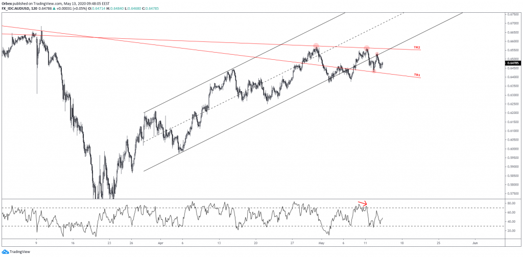 Aussie bulls failed to break the descending trendline TR2 twice now. With bears having had an easier job against weakening bulls, a breakout of the ascending channel starting Mar 26 occurred on May 11.