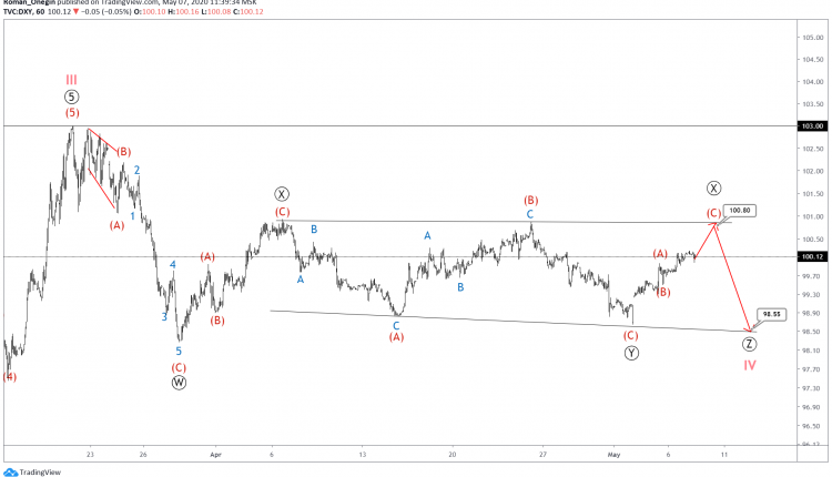 Of those, waves Ⓦ-Ⓧ-Ⓨ are completed. The second intervening wave Ⓧ, however, is still under development and could complete its correction as an (A)-(B)-(C) zigzag near 100.80.