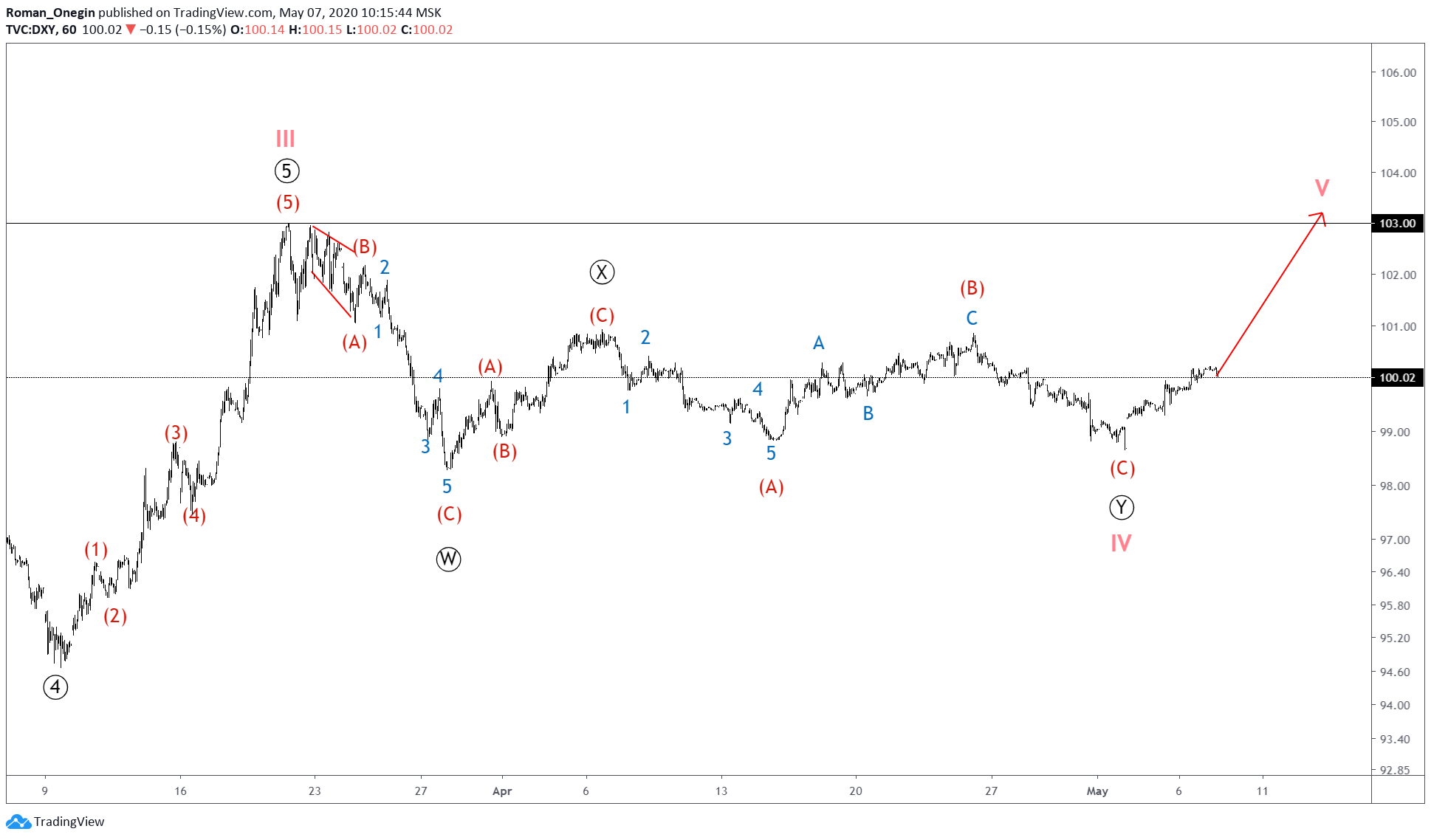 The DXY structure hints to a bullish 5-wave impulse consisting of cycle degree sub-waves I-II-III-IV-V. The fourth wave is currently under development.