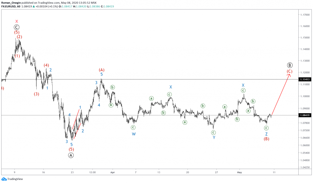 The current EURUSD structure hints to a zigzag consisting of waves Ⓐ-Ⓑ-Ⓒ. The primary wave Ⓑ of the bearish pattern is a zigzag.