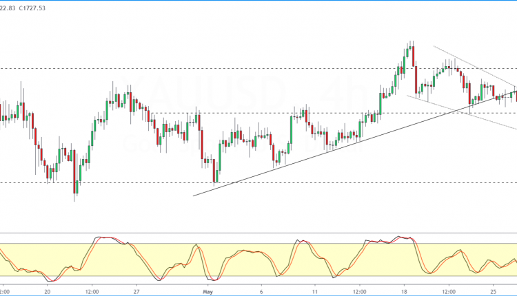 Gold prices are trading close to the 1728 level as the rising trend line is broken.