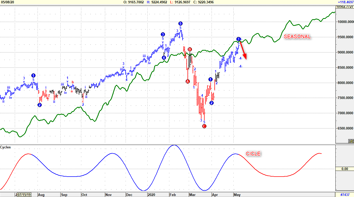 Continua la prepotente azione rialzista per l’indice Nasdaq100 con la dinamica in allungo ben oltre la resistenza precedentemente stimata a quota 8,950. La configurazione tecnica descritta nei precedenti report che ribadiva il completamento di onda Onda 4 reattiva in attesa dell’innesco di Onda 5 ribassista su quota 8,200, ha perso completamente di significato, con obbligo di riconteggio delle onde e verifica dell’intera struttura tecnica. Quota 8,750, in armonia con il 61,8% di recupero dopo l’affondo sui minimi a 6,771 non offre più un riferimento operativo; quota 8,950, come su scritto, è stata ampiamente superata, resta da verificare il run away gap aperto a fine febbraio prima di un re-test sui massimi assoluti. Supporto a 8.950. Neutra la componente stagionale in sincronia con una ciclicità negativa.