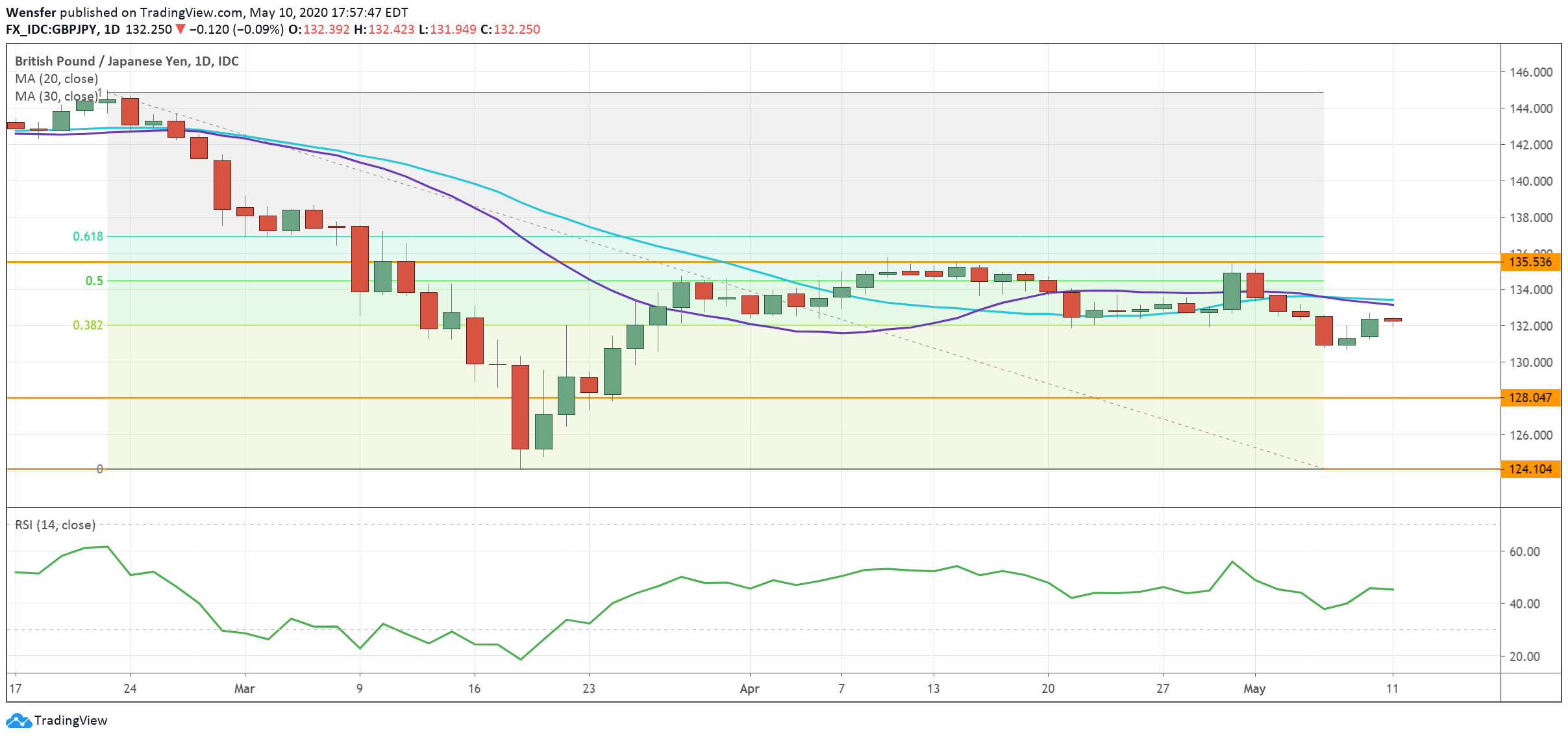The pound has started to head lower near the 50% (134.50) Fibonacci retracement level. A drop below 128.00 could lead to a sell-off into 124s.