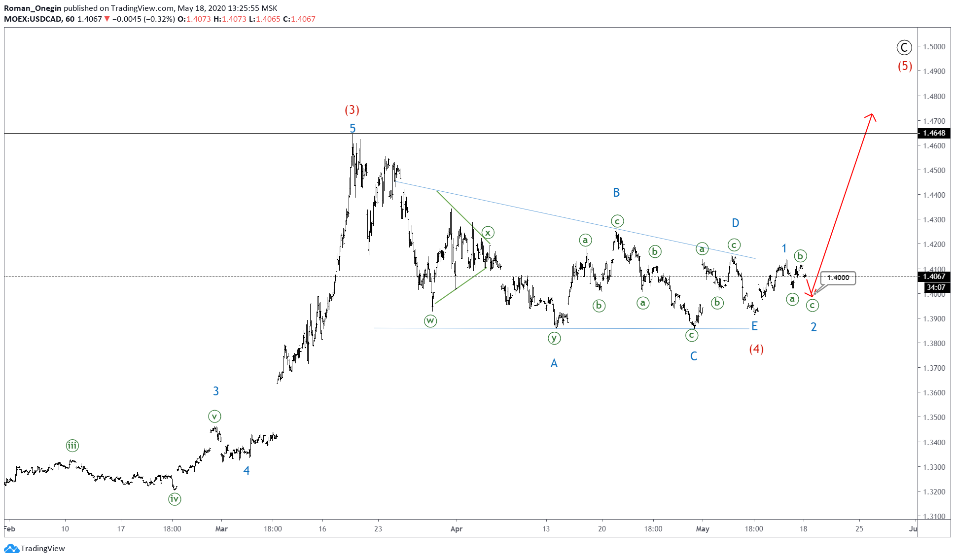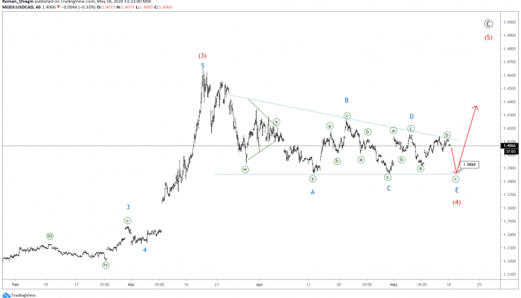 The end of wave E could lead to a price drop to 1.38. This level is the triangle support connecting waves A and C.