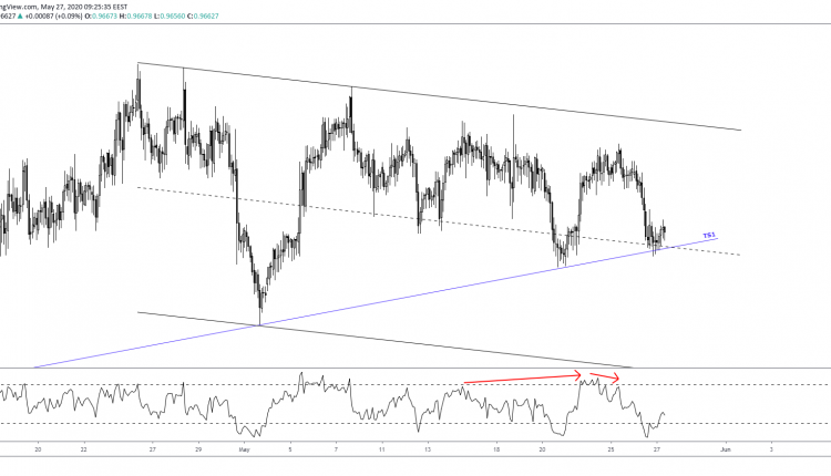 In case bulls come in stronger, we could see the retracement reaching the 50% Fibonacci at 0.9689. This is also where the apex of the higher/high-lower/low structure ends.