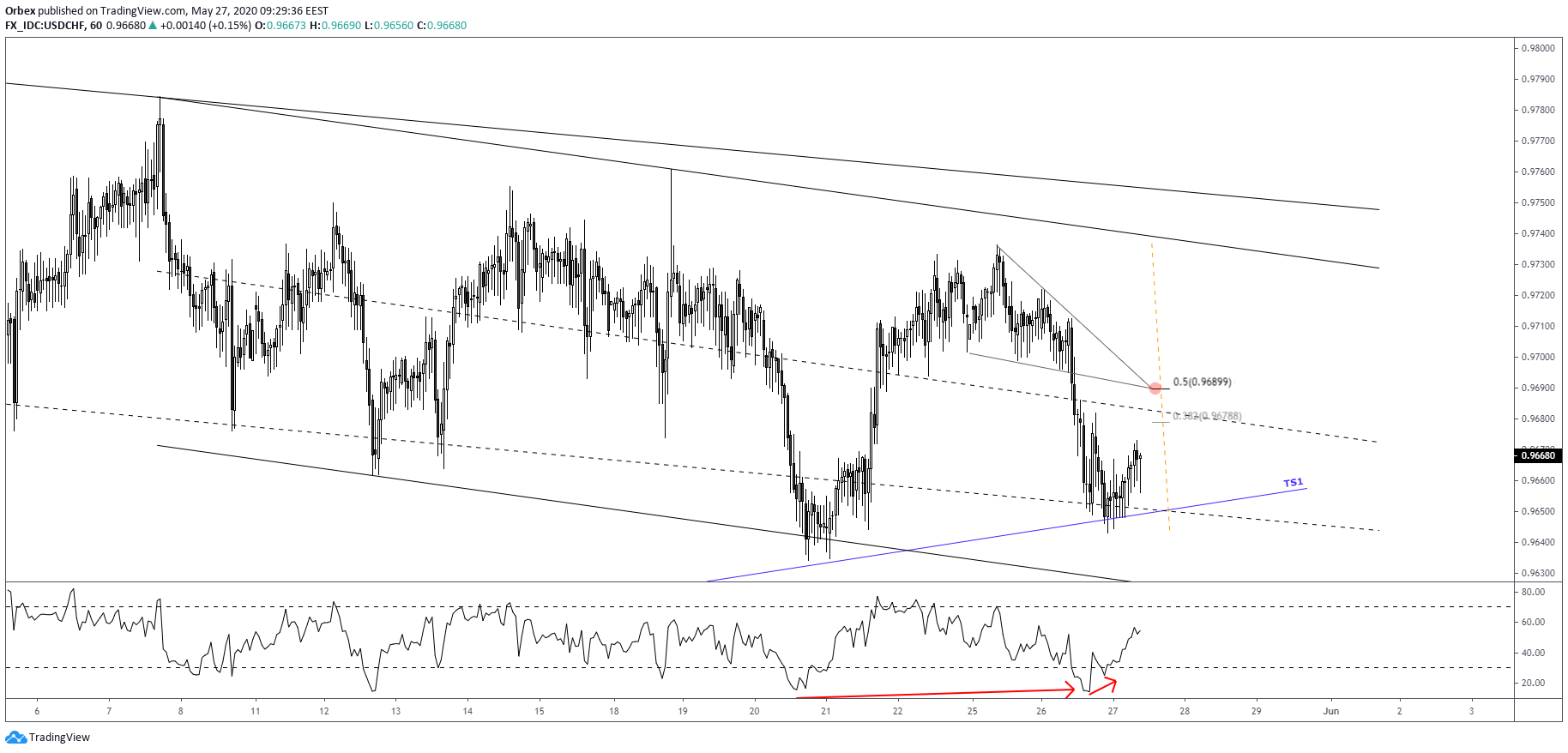 Before breaking the descending channel, however, we could see prices retracing higher. The signal is supported by the short-term RSI (9).