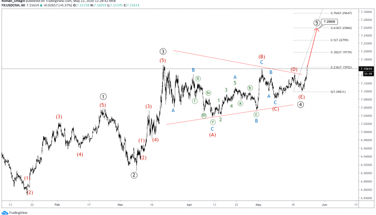 The USDCNH structure shows a bullish trend consisting of waves ①-②-③-④-⑤.