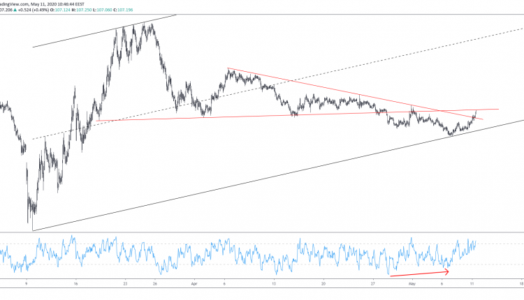 One swing low at 106.25 and one at 106.75 have both supported the upside initiative since. The latter, followed by a break above the descending trendline starting Apr 06, looks promising. Not only does it carry high momentum but it is also supported by an RSI (9) divergence on the 1-hour chart (as seen above).