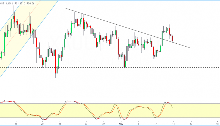 Price action broke to the upside of the falling trend line, briefly rising above the 1712.50 price level.