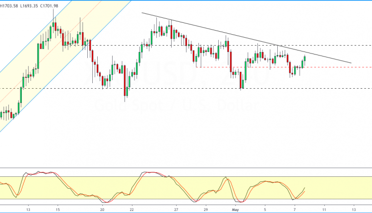 An upside breakout of the trend line could push prices to the 1712.50 level of resistance.