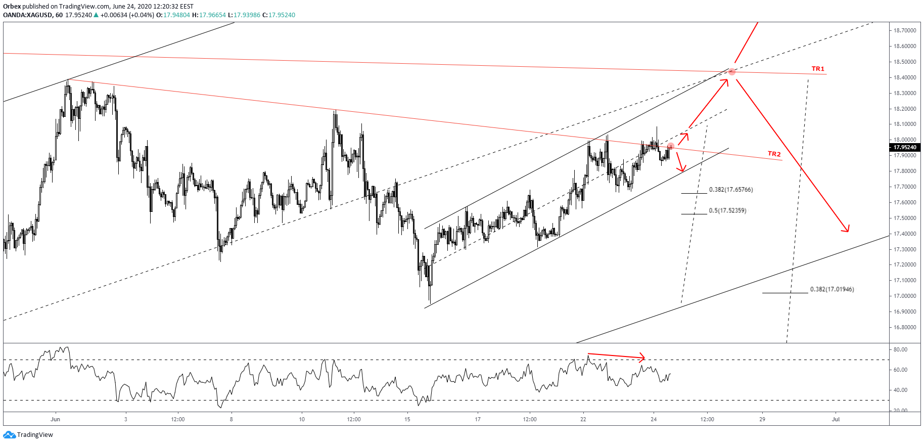 If it will give in to bullish pressures we can expect a stronger attempt to take over the $18.50 confluence zone. If the TR2 median trendline holds, then traders can turn their attention to a potential retest of the TR2 trendline (now support).
